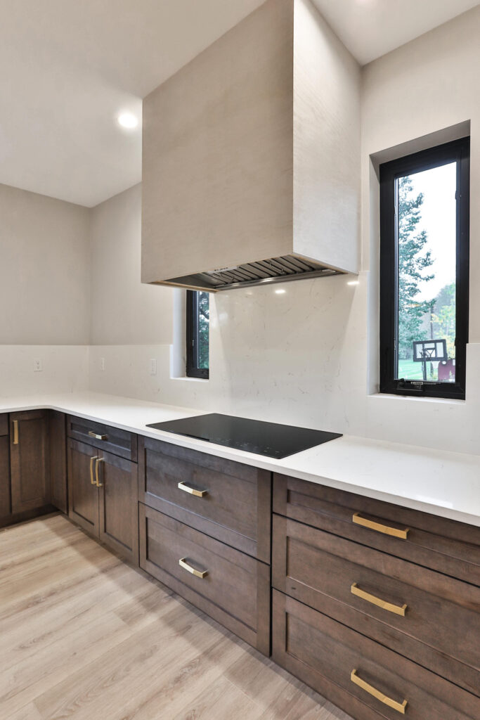 The cabinetry in the kitchen was designed with cabinet box lowers and future floating shelves above. The center island offers seating for quick meals and drawers for storage. The cooktop has a double stack of drawers below for even more useable storage space. The range hood was built on site and painted to match the fireplace surround that is on the opposite wall.