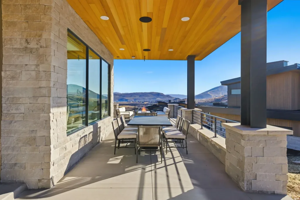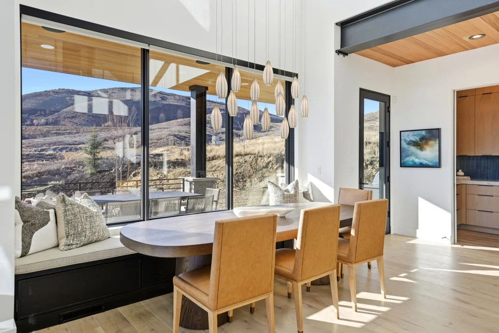 Exterior materials and roof design were meticulously planned, giving a sculptural effect the recalls the peaks and valleys of the Wasatch but also offering practicality for the signature blankets of snow. Inside, a layered palette of natural materials and clean lines strike an organic balance with the beauty outside, complementing the breathtaking views.