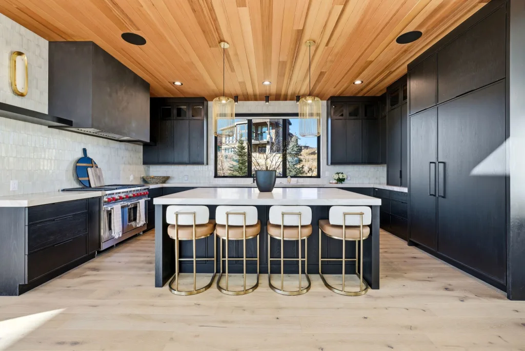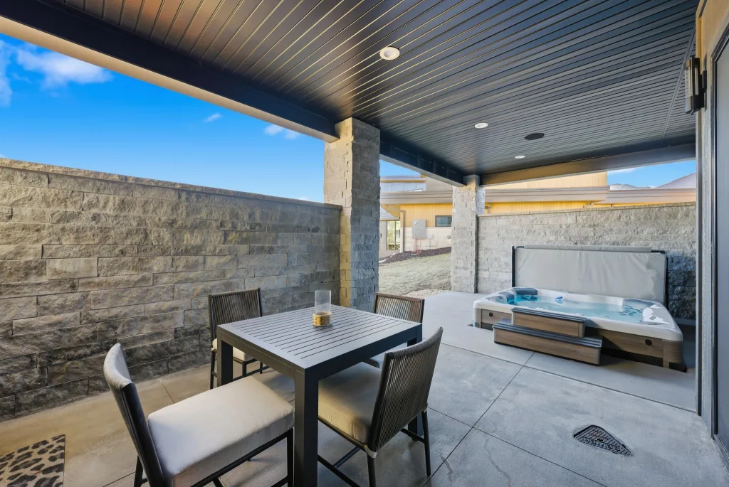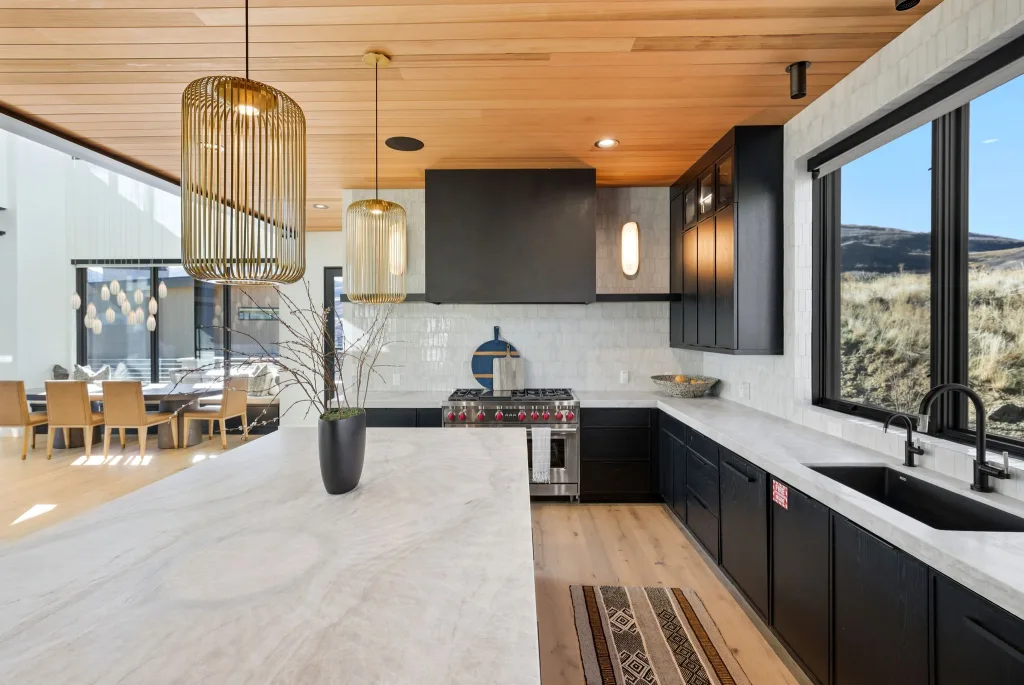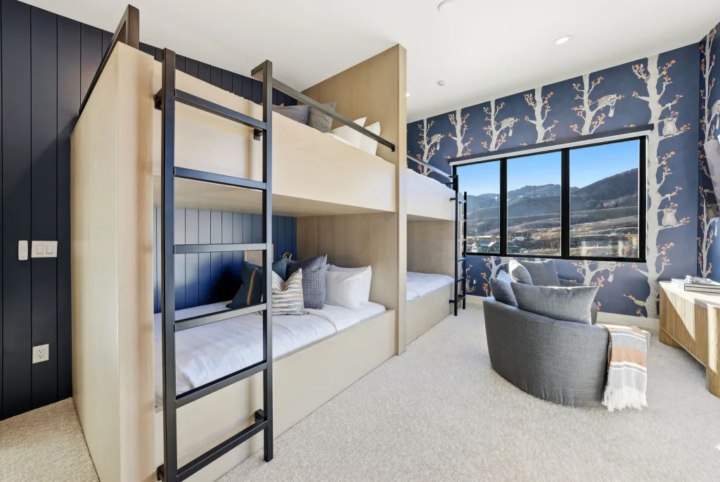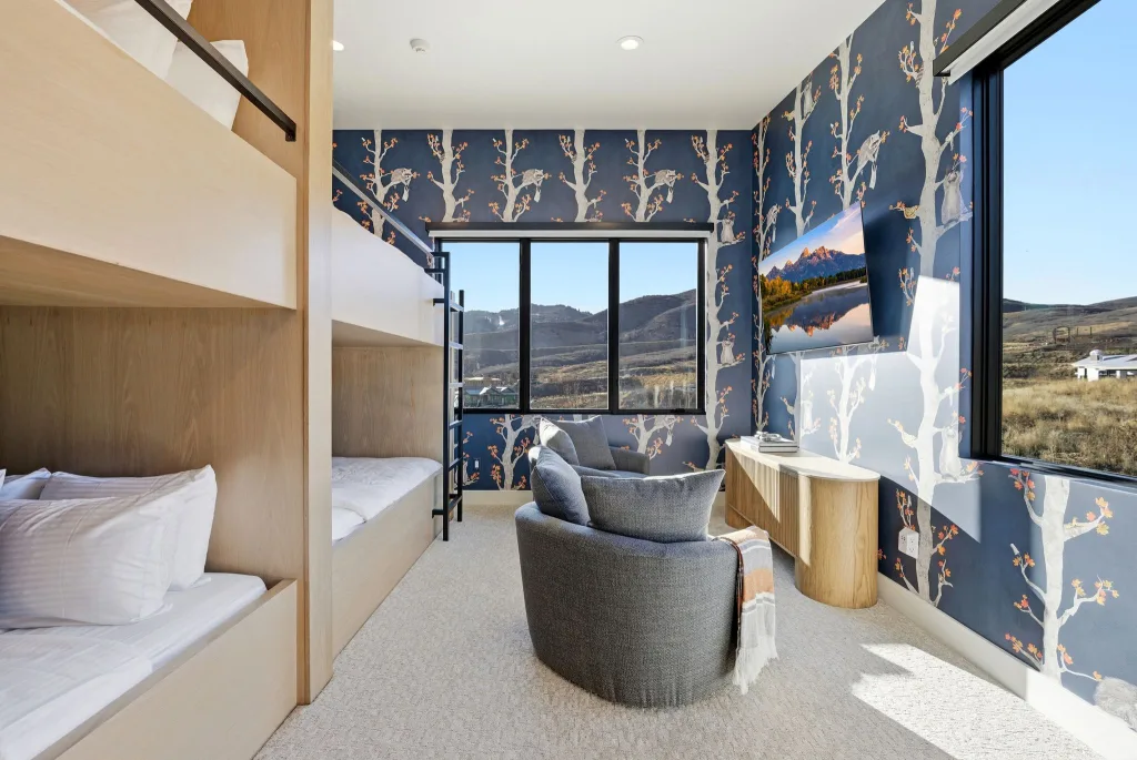 A custom bunk room on the upper level makes winding down after adventures effortless for even the littlest family members. The outdoor kitchen, patio heaters, and sunken hot tub extend the home’s gathering spaces into the outdoors year-round, whether for long summer evenings and winter après.