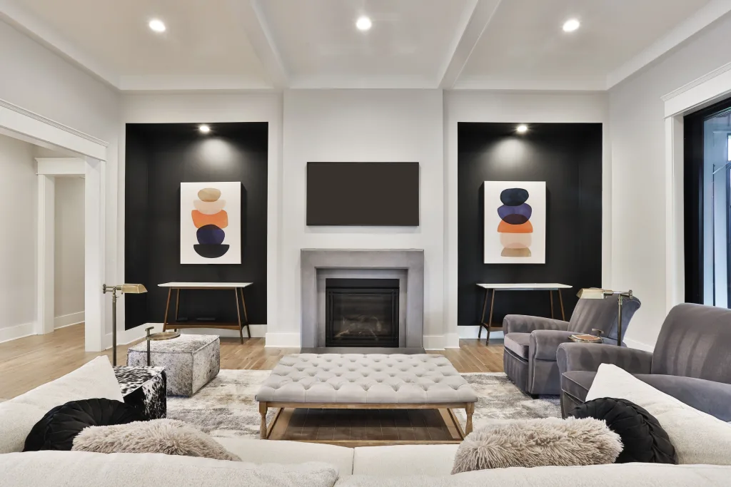 The spacious family room with soaring coffered ceilings is anchored by a cast stone fireplace that calls back the exterior accents. Two lighted artwork niches flank the fireplace are painted in the eye catching Sherwin Williams Tricorn Black, which is also used for interior doors and the ceiling in the music room. This rich, deep color is balanced with Gossamer Veil as the primary shade on the remaining interior walls and White Dove on the ceilings and trim, both also from Sherwin Williams.