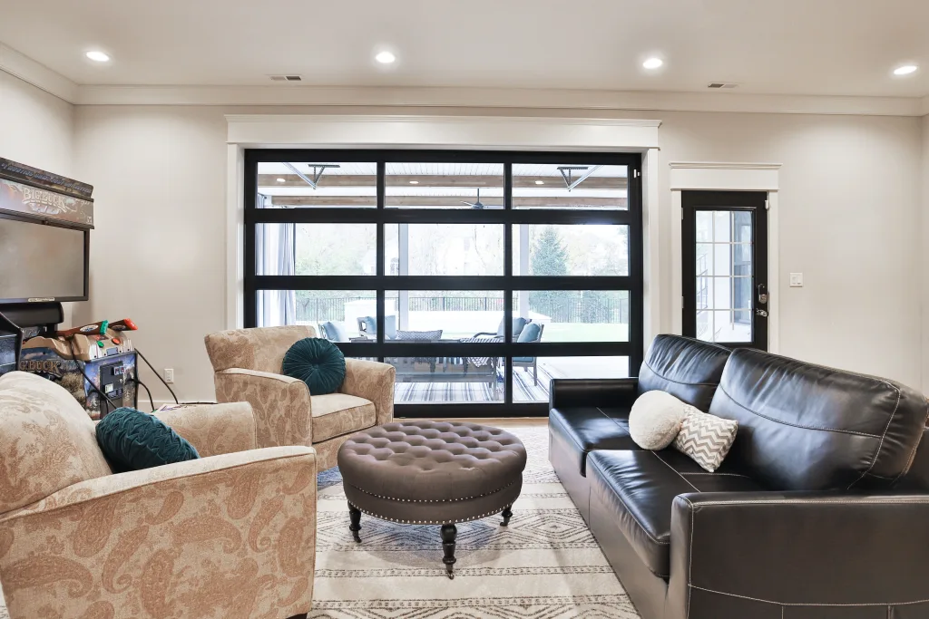 Downstairs is a central recreation area with a live edge bar that opens to a second outdoor living space through a full-view garage door. The lower-level deck overlooks the stone-enclosed pool, complete with a fire feature.