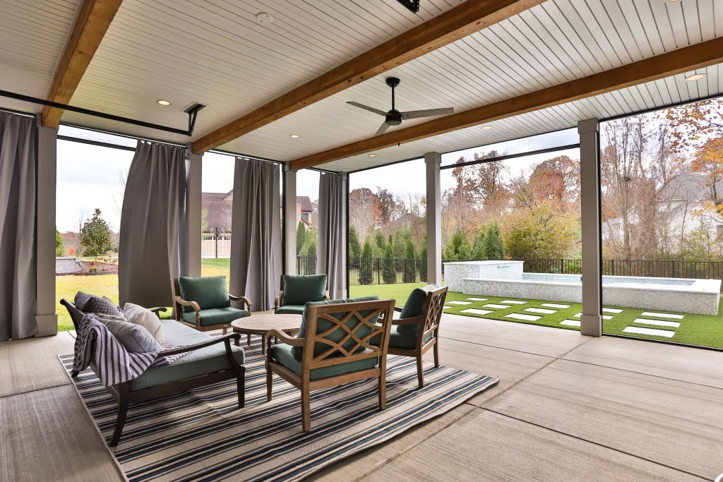 The family room opens onto a large four-seasons room via a wall of 9-foot multi-slide doors that connect the indoor and outdoor living spaces seamlessly. The vaulted ceiling warms up the glass lined room with rough-hewn and aged wooden planks and beams. A pass-through window is perched atop a small bar-style seating area that can be easily served from the counter and bar on the inside.